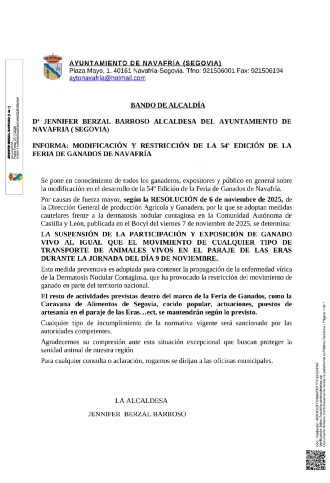 En este sentido, el Ayuntamiento de Navafría ha emitido un bando municipal en el que se informa de «la suspensión de la participación y exposición de ganado vivo al igual que el movimiento de cualquier tipo de transporte de animales vivos en el paraje de las Eras durante la jornada del día 9 de noviembre». No obstante, «el resto de actividades previstas dentro del marco de la Feria de Ganados, como la Caravana de Alimentos de Segovia, cocido popular, actuaciones, puestos de artesanía en el paraje de las Eras…etc, se mantendrá según lo previsto».
