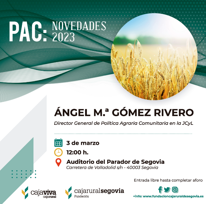 La jornada ‘PAC: Novedades 2023’, auspiciada por la Fundación Caja Rural de Segovia, se desarrollará el 3 de marzo, a partir de las 12:00 horas. La entrada al Auditorio del Parador de Segovia para asistir a la charla será libre, hasta completar aforo.