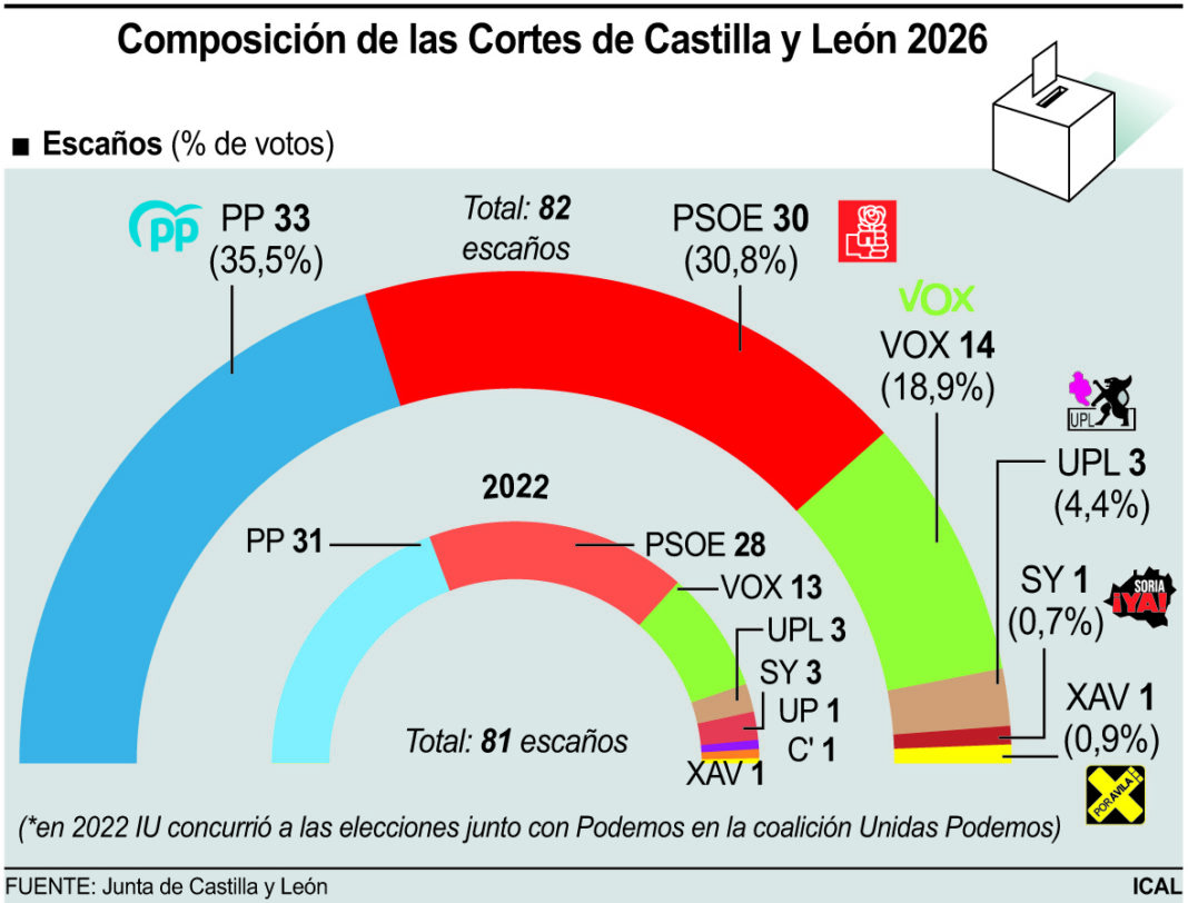 El nuevo Parlamento autonómico estará formado por 82 procuradores, distribuidos en 33 del PP, 30 del PSOE, 14 de Vox, tres de UPL, uno de Soria Ya y uno de Por Ávila.