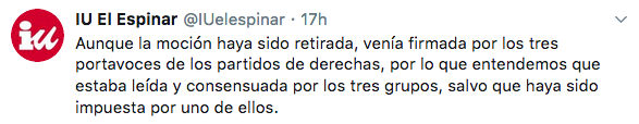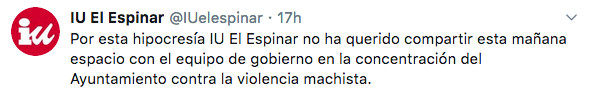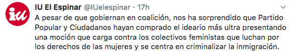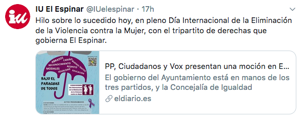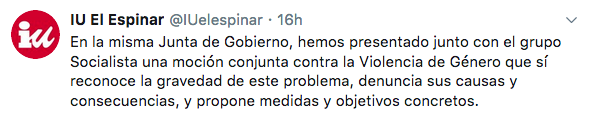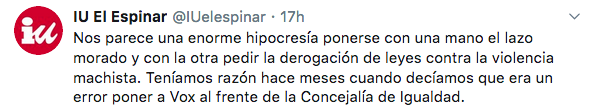 Izquierda Unida también quiero hacer notar su opinión a través de un hilo de Twitter, en el que manifiestan que es una «hipocresía ponerse con una mano el lazo morado y con la tora pedir la derogación de leyes contra la violencia machista».