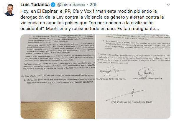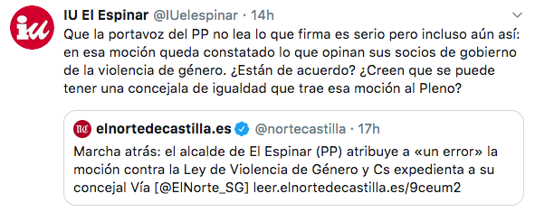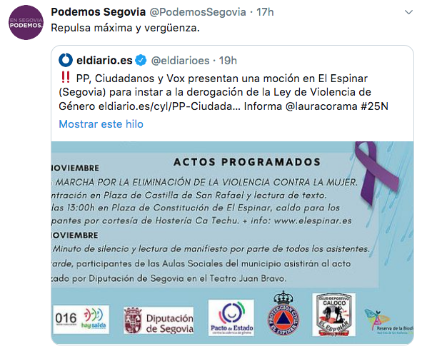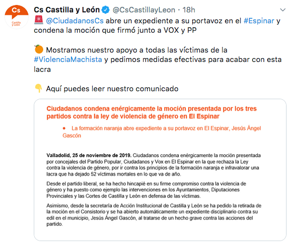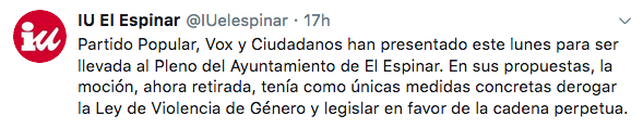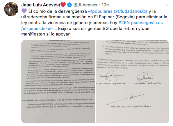 Durante el día de ayer, PP, Cs y Vox en El Espinar (Segovia) presentaron una moción que pedía derogar la Ley contra la violencia de género. Estos actos fueron condenados por el resto de formaciones políticas, pero incluso por Ciudadanos.
