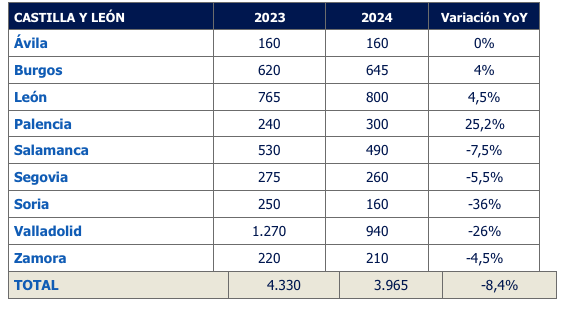 En Castilla y León se registrarán casi 4.000 contratos, un 8,4% menos que en 2023 cuando se firmaron 4.330. Por provincias, la que mejor se comporta es Palencia con 300 (+25%), León con 800 contratos (+4,5%) y Burgos con 645 (+4%). También se mantiene con el mismo volumen Ávila con 160 vacantes. Por otro lado, las provincias que registran las caídas más acentuadas son Soria con 160 contratos (-36%) y Valladolid con 940 (-26%).