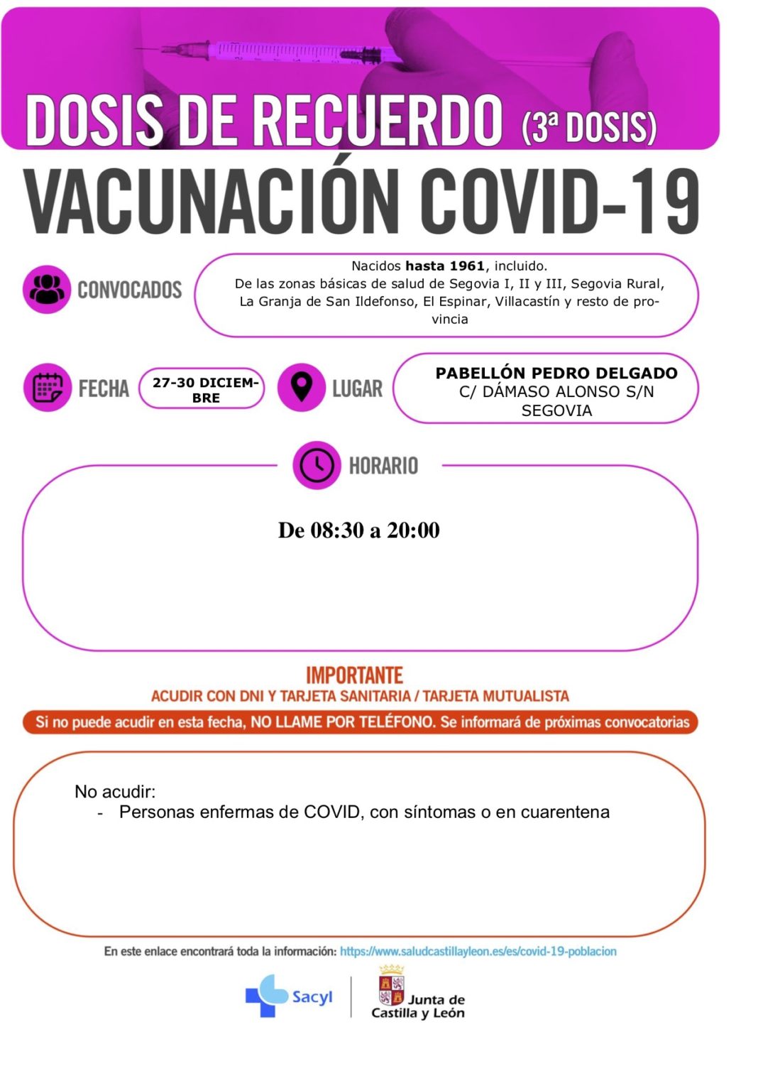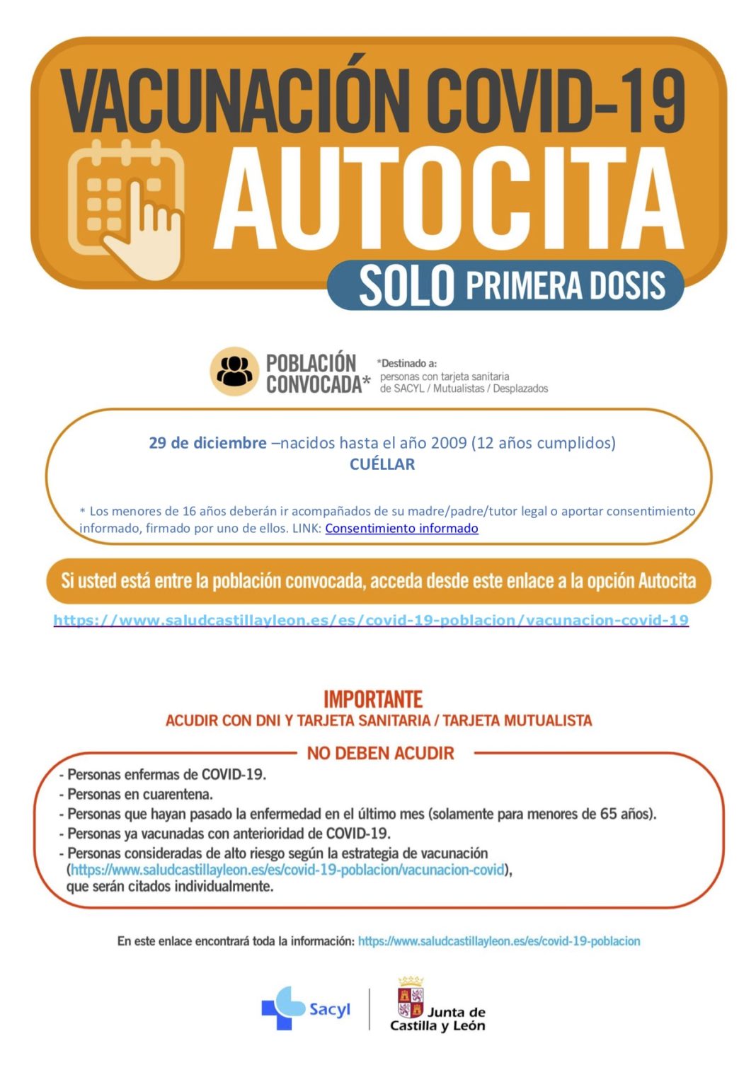 La Gerencia de Salud de Castilla y León convoca a niños hasta 12 años cumplidos para vacunarse de COVID (sólo primera dosis) el 29 de diciembre en Cuéllar y el 30 de diciembre en Cantalejo a través del sistema de autocita.