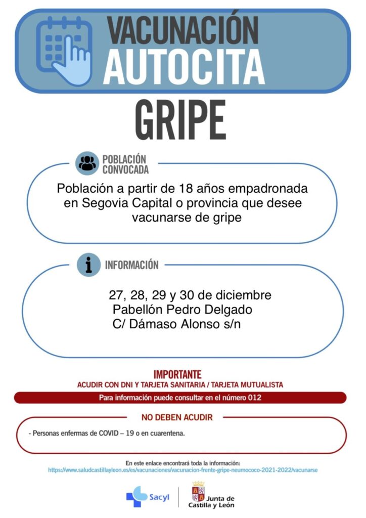 Los días 27, 28, 29 y 30, a través del sistema de autocita, se convoca a los segovianos mayores de 18 años (empadronados tanto en Segovia capital como provincia) que quieran vacunarse de la gripe.