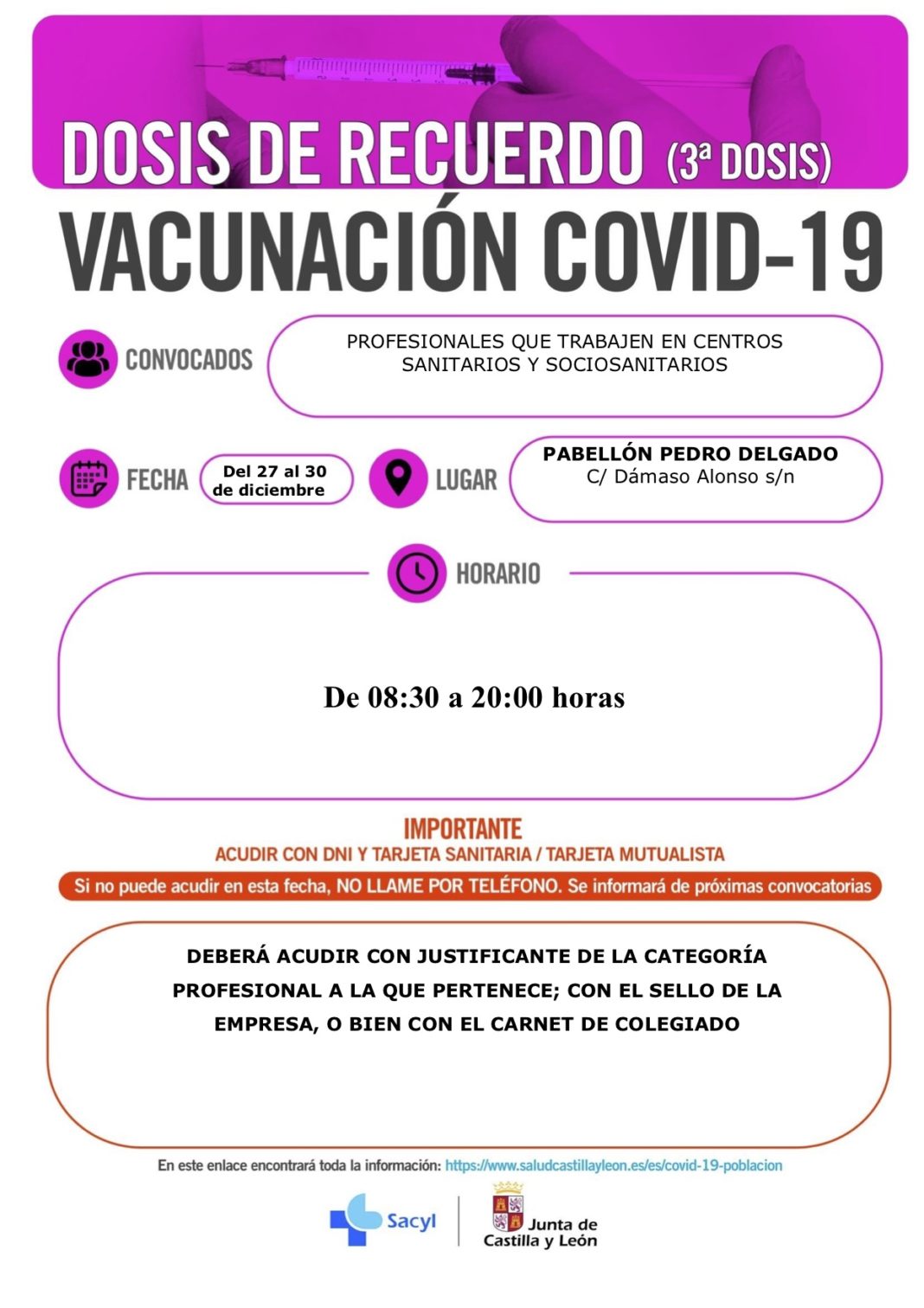 También del 27 al 30 de diciembre se convoca a los profesionales que trabajen en centros sanitarios y sociosanitarios a recibir su tercera dosis contra la COVID-19 en el Pabellón Pedro Delgado: