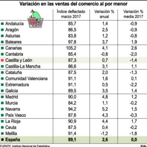 El instituto Nacional de Estadística ha publicado la Encuesta de Índices de Comercio al por Menor, en la que se registra un crecimiento del 0,7 % en las ventas de comercio al por menor en la Comunidad en relación al mismo mes del pasado año, mientras que la media nacional experimentó un aumento del 2,6 %.