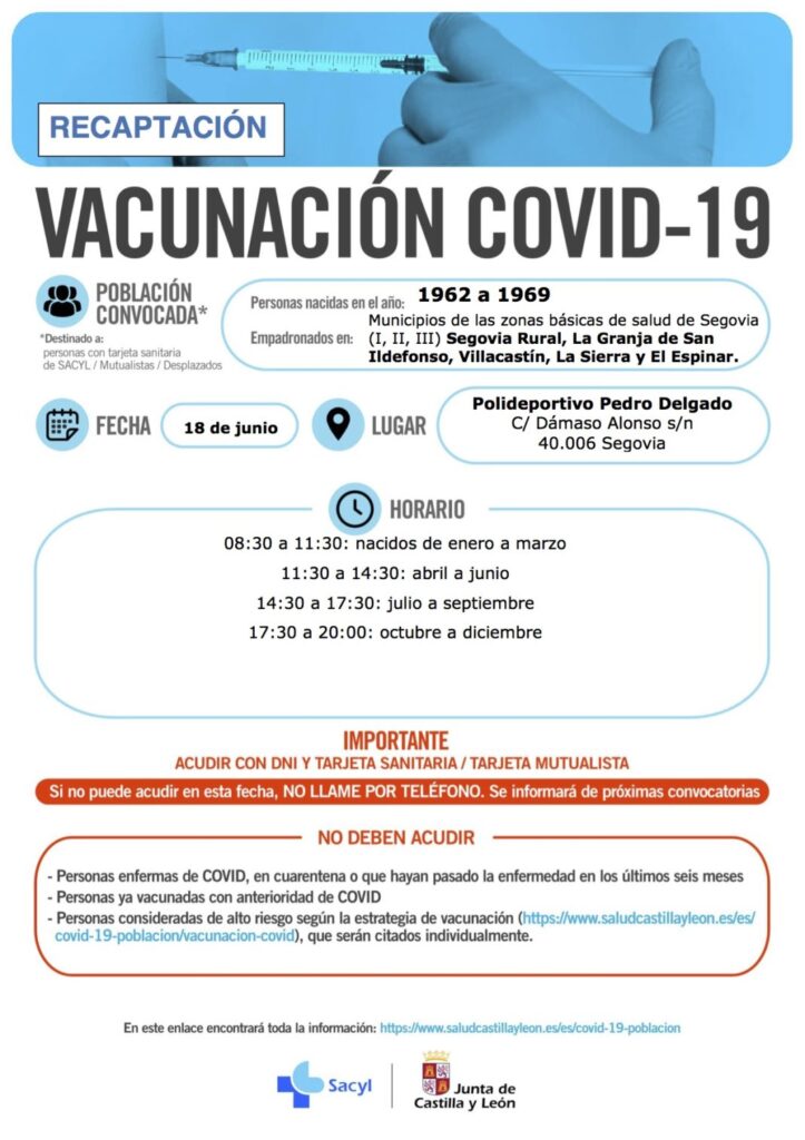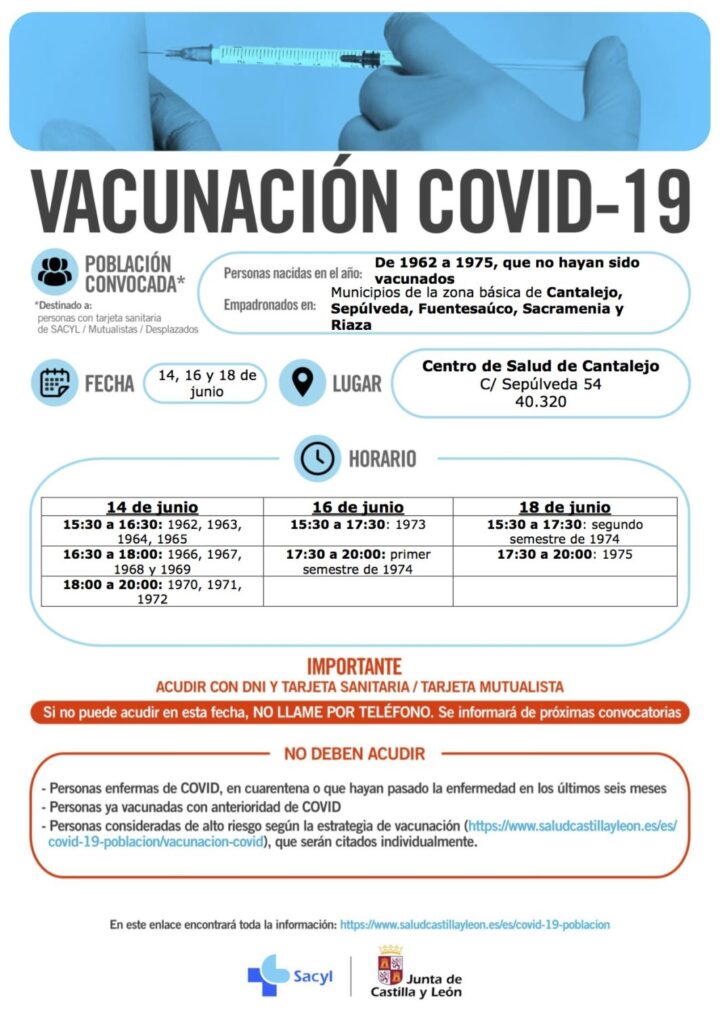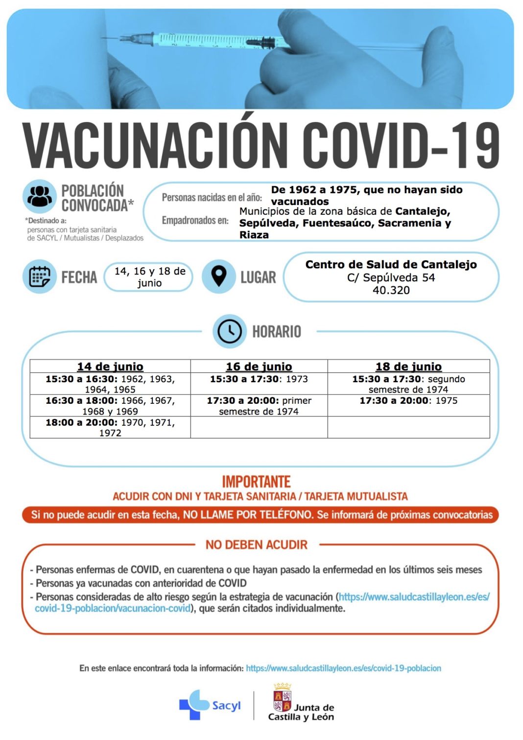 En el centro de salud Cantalejo, punto fijo de vacunación de referencia para los residentes en las zonas básicas de salud de Cantalejo, Sepúlveda, Riaza, Fuentesaúco de Fuentidueña y Sacramenia, los días de vacunación semanal son los lunes, miércoles y viernes, desde las 15.30 a las 20.00 horas. El lunes, 14 de junio, entre las 15.30 y las 18.00 horas, se vacunará a los nacidos entre 1962 y 1969 que no se han vacunado en fechas anteriores, y desde las 18.00 a las 20.00 horas, se aplicará la primera dosis a los nacidos en 1970, 1971 y 1972. El miércoles, 16 de junio, se administrará la primera dosis a los nacidos en 1973 y en el primer semestre de 1974, y el viernes, 18 de junio, están convocados los nacidos en 1975.