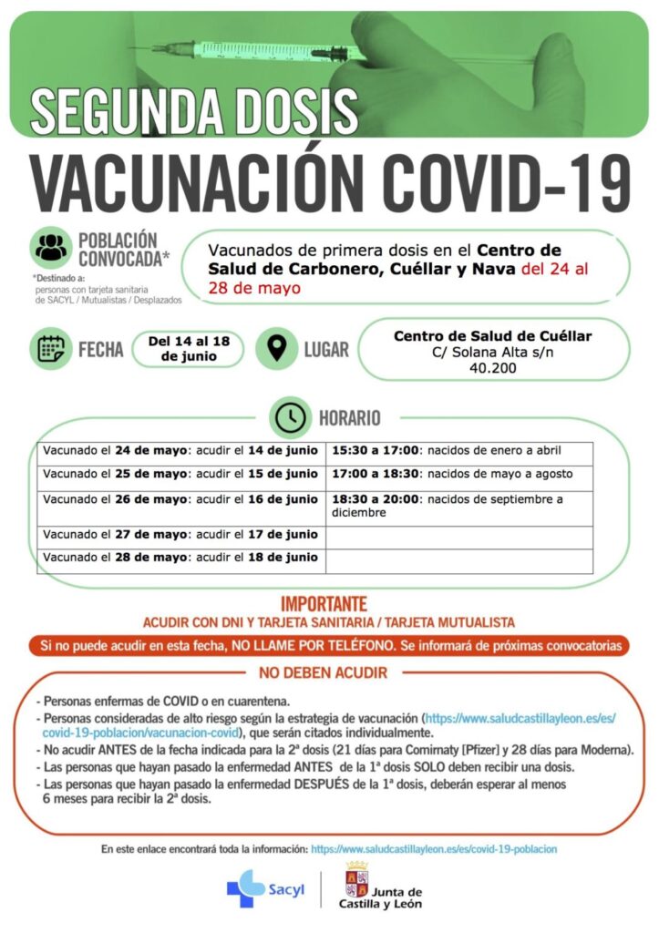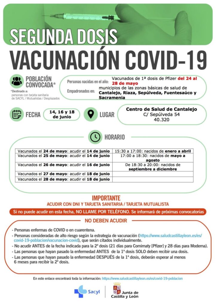 En cuanto a los puntos fijos de vacunación de Cuéllar y Cantalejo administrarán segundas dosis de la vacuna contra covid-19 a lo largo de la próxima semana a los ciudadanos que fueron vacunados entre el 24 y 28 de mayo.