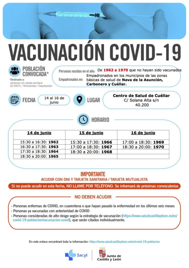 En el punto fijo de vacunación del centro de salud de Cuéllar, al que deben dirigirse los ciudadanos de las zonas básicas de salud de Cuéllar, Carbonero el Mayor y Nava de la Asunción, los días 14, 15 y 16 de junio se vacunará con la primera dosis a todos los nacidos entre 1962 y 1969 que todavía no hayan recibido la vacuna. Además, en la tarde del miércoles, 16 de junio, se aplicará la primera dosis a los nacidos en 1970 de esas zonas básicas de salud. El horario en el que permanecen abiertas las líneas de vacunación es de 15.30 a 20.00 horas.