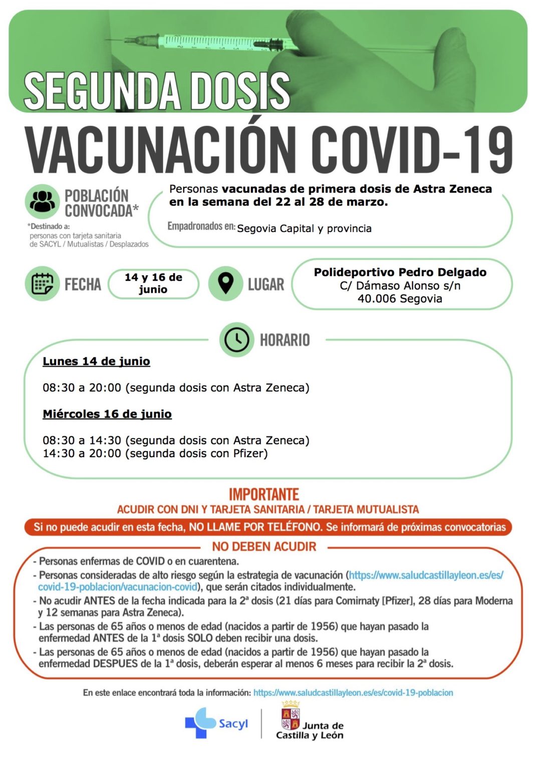 En el pabellón ‘Pedro Delgado’, se hacen llamamientos para vacunar con segunda dosis el lunes, miércoles y jueves próximos. De ellos, en cuanto a AstraZeneca, el lunes, 14 de junio, y el miércoles, 16 de junio, se administrarán segundas dosis a las personas de la capital y provincia vacunadas con antivirales de esta farmacéutica en la semana del 22 al 28 de marzo. Recordar que los ciudadanos que iniciaron el ciclo de vacunación con AstraZeneca deben cumplimentar el consentimiento informado que puede descargarse en la web de salud de Castilla y León en el siguiente enlace: https://www.saludcastillayleon.es/es/covid-19-poblacion/vacunacion-covid/informacion-segunda-dosis-vacunacion-frente-covid-19, aunque también estará disponible el documento en el punto de vacunación.