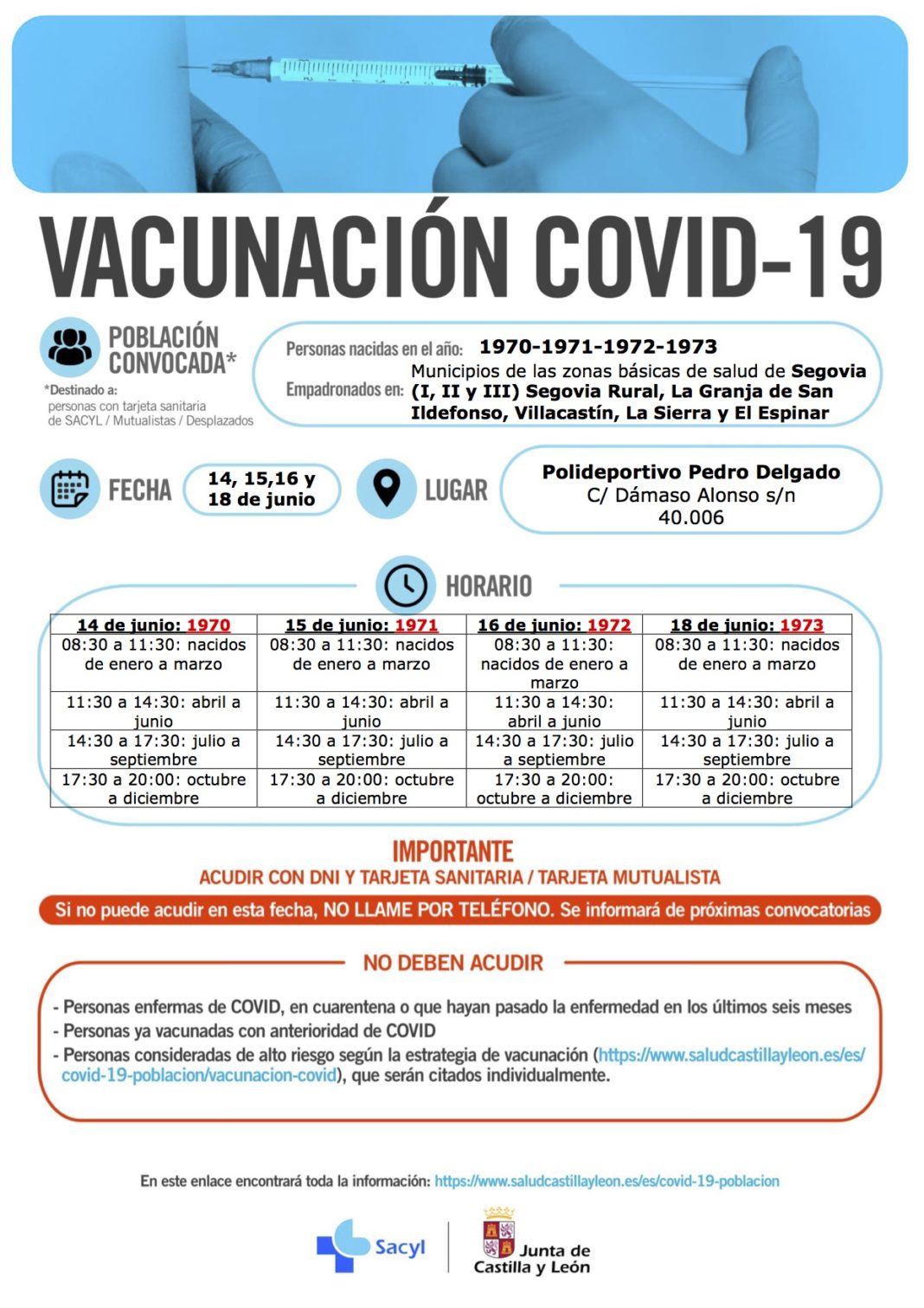 En el punto fijo de vacunación del pabellón ‘Pedro Delgado’, al que deben acudir los residentes de las zonas básicas de salud urbanas (Segovia I, II y II) y de las zonas básicas de salud de San Ildefonso, Segovia Rural, Villacastín, El Espinar y La Sierra, el lunes, 14 de junio, se administrará la primera dosis de la vacuna contra la COVID-19, a los nacidos en 1970; el martes, 15 de junio, a los nacidos en 1971; el miércoles, 16 de junio, a los nacidos en 1972; y el viernes, 18 de junio, a los nacidos en 1973.
