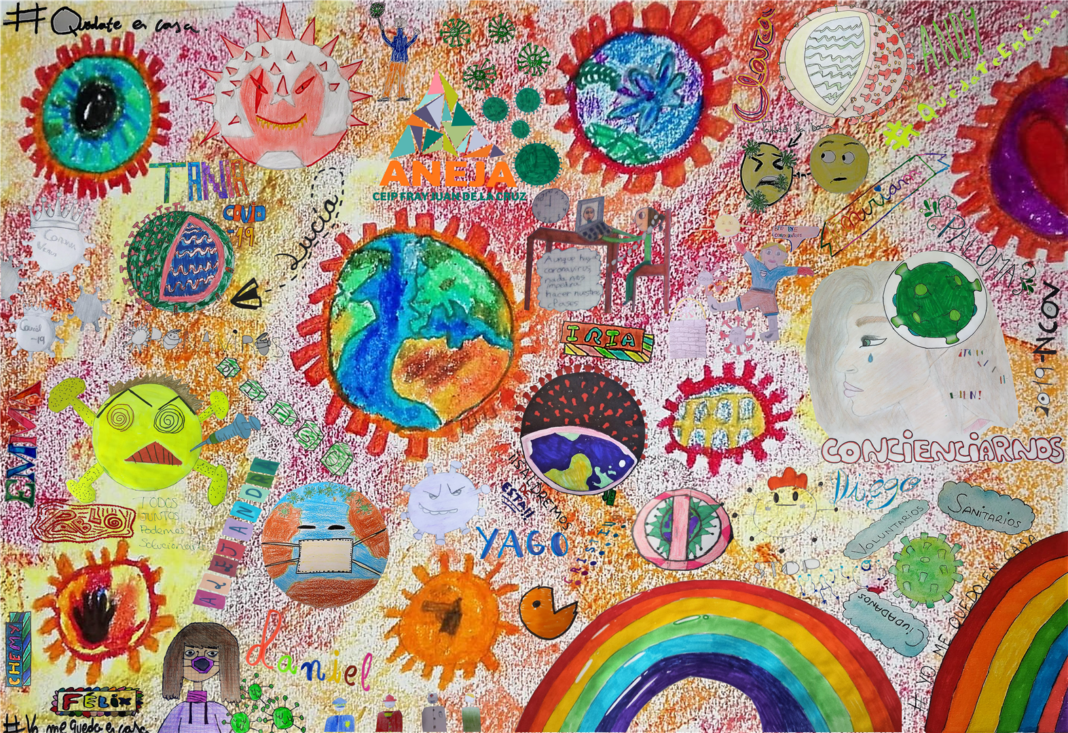 Estos alumnos de sexto quieren dedicar a toda la comunidad educativa de nuestra provincia su último trabajo de plástica, rematado apenas unos minutos antes de comenzar las vacaciones de Semana Santa. Se trata de una composición digital, realizada a partir de todos los trabajos plásticos realizados en sus casas sobre el coronavirus y después fotografiados para su envío, combinados con sus nombres y con un buen número de consignas y frases de ánimo y positividad, de cara a la salida de esta situación. De la misma manera que han visto como algunos de los confinados unían fuerzas para componer canciones, coreografías, carreras solidarias,… ellos han querido hacen una composición plástica coral, con la que pretenden reflejar toda su esperanza en que, unidos y cumpliendo las normas sanitarias, podamos acabar con esta amenaza y seamos capaces de aprender la lección para que dejemos de hacer daño al planeta y esto no vuelva a suceder. Ahora ha sido un virus, pero «en el futuro puede ser el cambio climático, sobre cuyos efectos y la necesidad de dar un giro radical a nuestra forma de vida, los niños estamos actualmente muy concienciados».