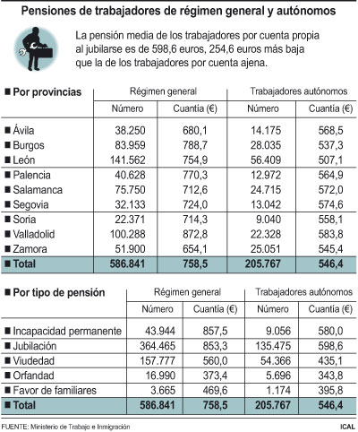 A los autónomos que trabajan en Castilla y León les queda cuando deciden jubilarse una pensión media de 598,69 euros mientras que el colectivo de trabajadores por cuenta ajena viene a cobrar del sistema de la Seguridad Social una pensión media de 853,31 euros, es decir, 254,62 euros más.