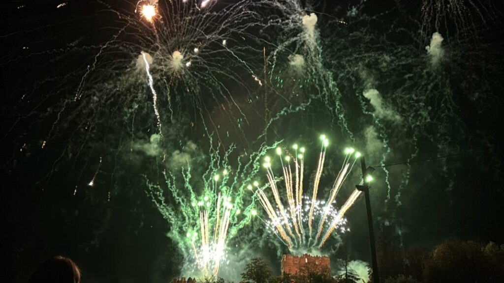 Este año, tras los 15 minutos de duración del espectáculo, los vecinos caucenses vivieron un momento de angustia al ver que luces naranjas y rojizas se reflejaban en la fachada del castillo. Pese a las precauciones, el foso del castillo comenzó a arder debido al mal funcionamiento de uno de los artefactos de pirotecnia.
