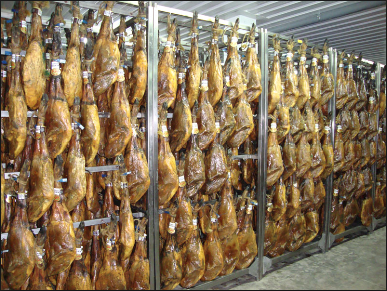 El jamón, una vez clasificado, se coloca en un sistema de perchas de cuelgue con capacidad cada una para 80 unidades, dispuestas en vías aéreas separadas 1,30 m. El método comienza desde el proceso de salado, y se extenderá hasta el secado y fase final de acabado del producto.