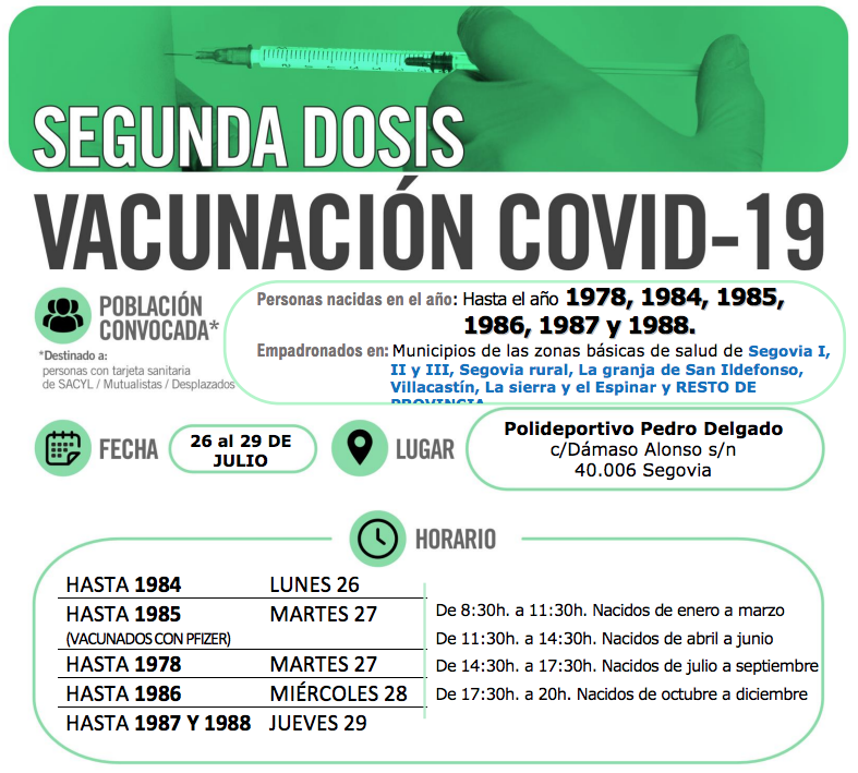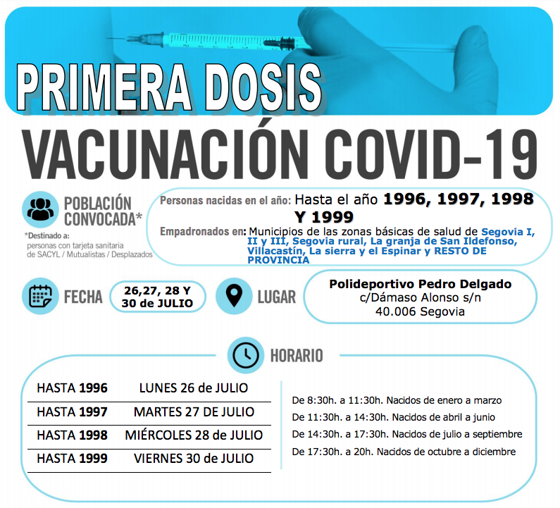 En el punto fijo de vacunación del centro de salud de Cuéllar, al que deben dirigirse los ciudadanos de las zonas básicas de salud de Cuéllar, Carbonero el Mayor y Nava de la Asunción, se vacunará el martes, 27 de julio, a los nacidos en 1996 y 1997; y el jueves, 29 de julio, a los nacidos en 1998 y 1999.