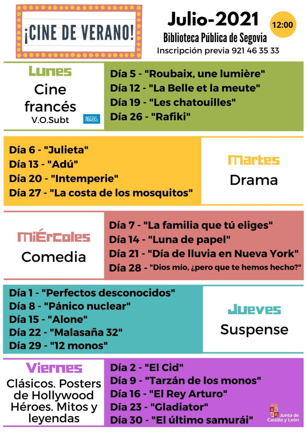 La Biblioteca Pública no olvida en julio a sus usuarios adultos y a este cartel de actividades hay que sumarle la programación de cine de lunes a viernes, a las 12.00 horas, en el salón de actos del centro. Cada día de la semana se dedica a un género del séptimo arte: los lunes, cine francés en versión original subtitulada; los martes, drama; los miércoles, comedia; los jueves, suspense; y los viernes, clásicos de héroes, mitos y leyendas.