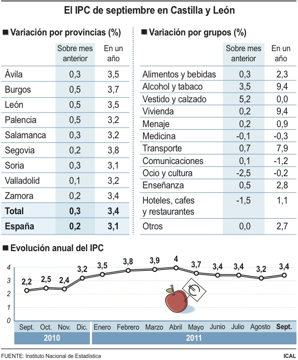 Los precios subieron en Segovia en el mes de septiembre un 0,2 por ciento respecto a agosto, lo que supone una décima menos que la anotada en Castilla y León, que experimenta un incremento del 0,3%. En lo que va del año el incremento acumulado es en Segovia del 1,2%, y variación interanual la del 3,8% siendo la provincia de la Comunidad que mayor aumento ha registrado. La tasa interanual de Castilla y León se mantiene en el 3,4 por ciento en la Comunidad, tres décimas por encima de la nacional, según los datos del Instituto Nacional de Estadística. Sin embargo, en lo que va de año, los precios aumentaron en la autonomía un 1,2 por ciento, mientras a nivel nacional la subida fue dos décimas inferior.