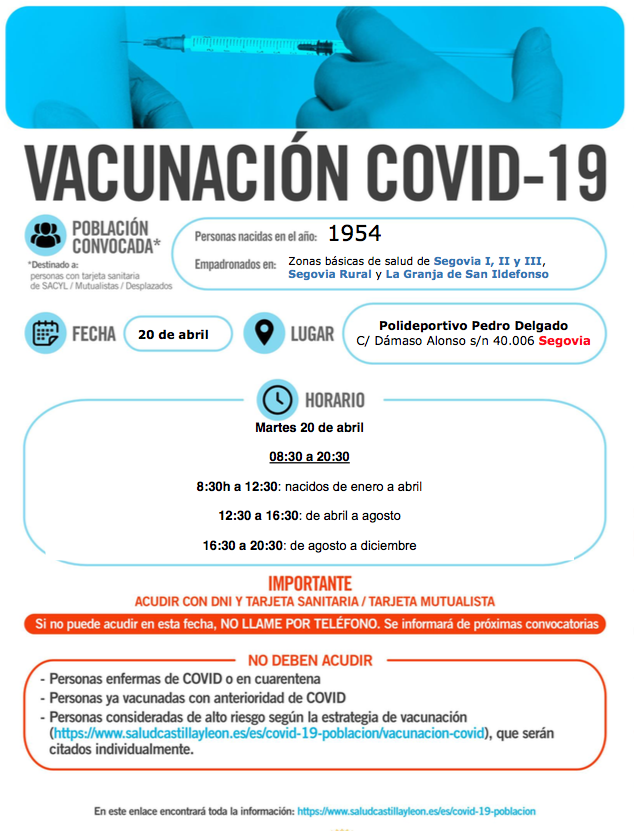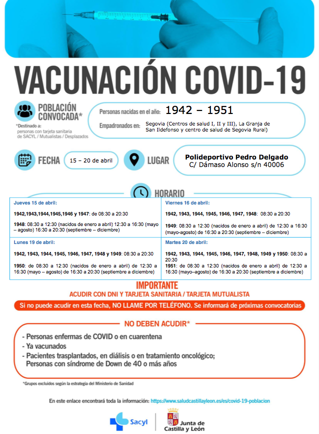 El lunes y martes, 19 y 20 de abril, la Junta de Castilla y León en Segovia inicia la vacunación contra la COVID-19 en el pabellón polideportivo ‘Pedro Delgado’ de la capital a las personas nacidas en 1950, 1951 y 1954.