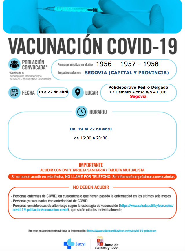 Además, la Gerencia de Asistencia Sanitaria hace un nuevo llamamiento para las personas nacidas en 1956,1957 y 1958 de toda la provincia que no pudieron recibir la vacuna en la fecha que correspondía a esta franja de edad. Estos ciudadanos pueden acudir a vacunarse al pabellón polideportivo ‘Pedro Delgado’ de Segovia entre el lunes, 19 de abril, y el jueves, 22 de abril, en horario de 15.30 a 20.00 horas.