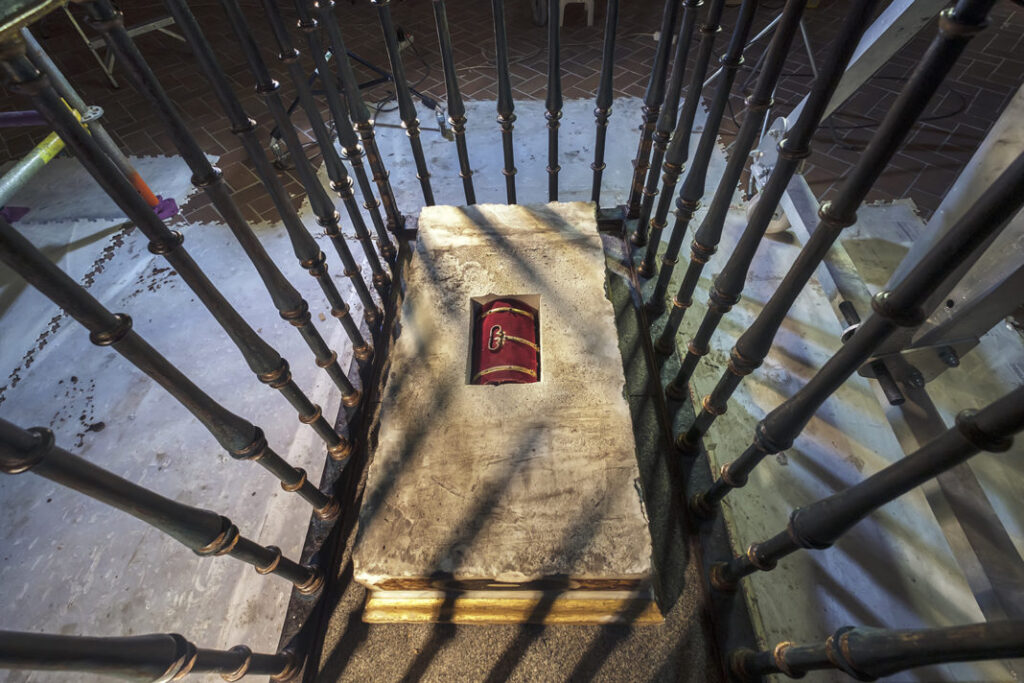 El cofre con los restos del Infante Don Pedro fue encontrado por los propios restauradores en un hueco abierto en la base, cuando se disponían a levantar la tapa con la efigie del niño para restaurarla de forma más cómoda.