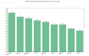 Si nos fijamos en los partes con terceros implicados, solo mantienen su posición Soria (que es la líder en ambos rankings) y Palencia que sigue siendo la sexta. El podio de los suspensos, en esa estadística, es para Salamanca, Burgos y Valladolid. Concretamente los salmantinos presentaron un 85% más de partes que los sorianos. Teniendo en cuenta este tipo de partes destaca también Soria en el ámbito nacional. Y es que es la provincia de toda España que menos da junto con Ceuta (solo un 4,1%).