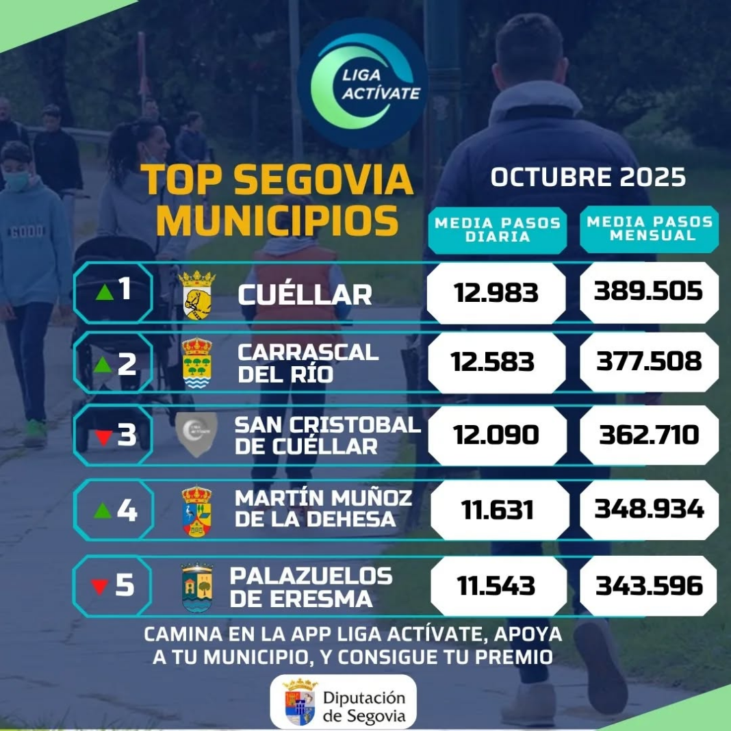Así, Cuéllar se alza con la victoria en Liga Actívate y se proclama como el municipio que más ha caminado en el mes de octubre de 2025, con 389.505 pasos. Esta victoria en el ranking refleja el nivel de actividad física de sus vecinos, que han conseguido mantener una media diaria de 12.983 pasos. Este número de pasos equivale a que cada vecino recorre de media 296 kilómetros caminando al mes y tiene un consumo calórico de 11.689 kcal.