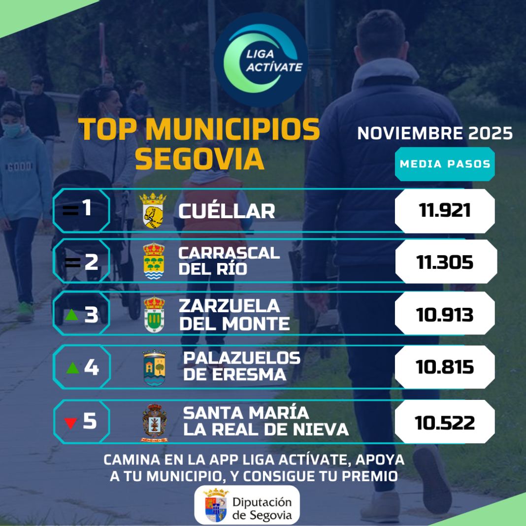 Cuéllar se alza con la victoria en Liga Actívate y se proclama como el municipio que más ha caminado en el mes de noviembre de 2025. Esta victoria en el ranking refleja el nivel de actividad física de sus vecinos, que han conseguido mantener una media de 11.921 pasos para su municipio durante el mes de noviembre.