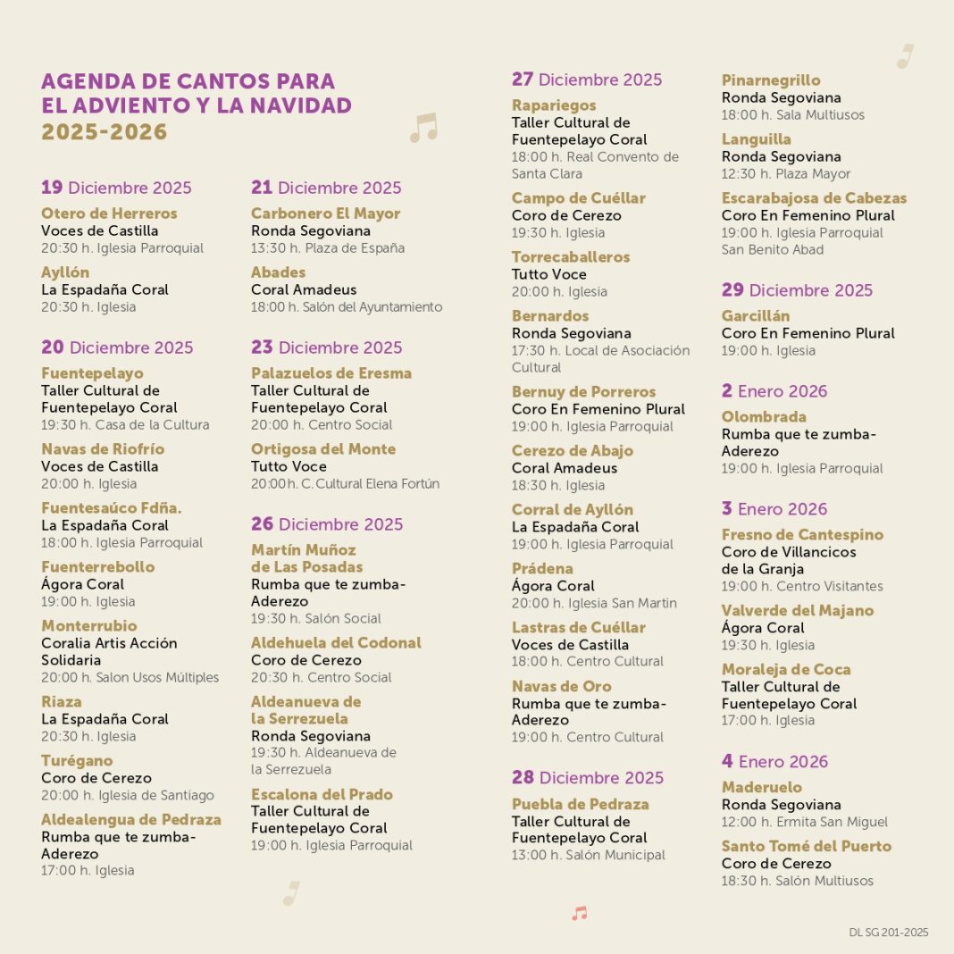 El programa recorrerá 39 municipios, iniciándose el 19 de diciembre en Otero de Herreros y Ayllón con las formaciones Voces de Castilla y La Espadaña Coral respectivamente, y concluyendo el 4 de enero en Santo Tomé del Puerto con el Coro de Cerezo.