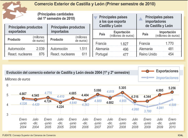 El comercio exterior de Castilla y León ha salvado el pozo de la crisis con un repunte del 20 por ciento durante el primer semestre de 2010 (respecto a 2009), periodo en el que se alcanzó un valor económico de 5.256 millones de euros, cifras que no registraban en la Comunidad desde antes de la recesión, allá por los primeros meses de 2008, momento en el que además se anotó el mayor importe de los últimos seis años, con algo más de 5.300 millones.