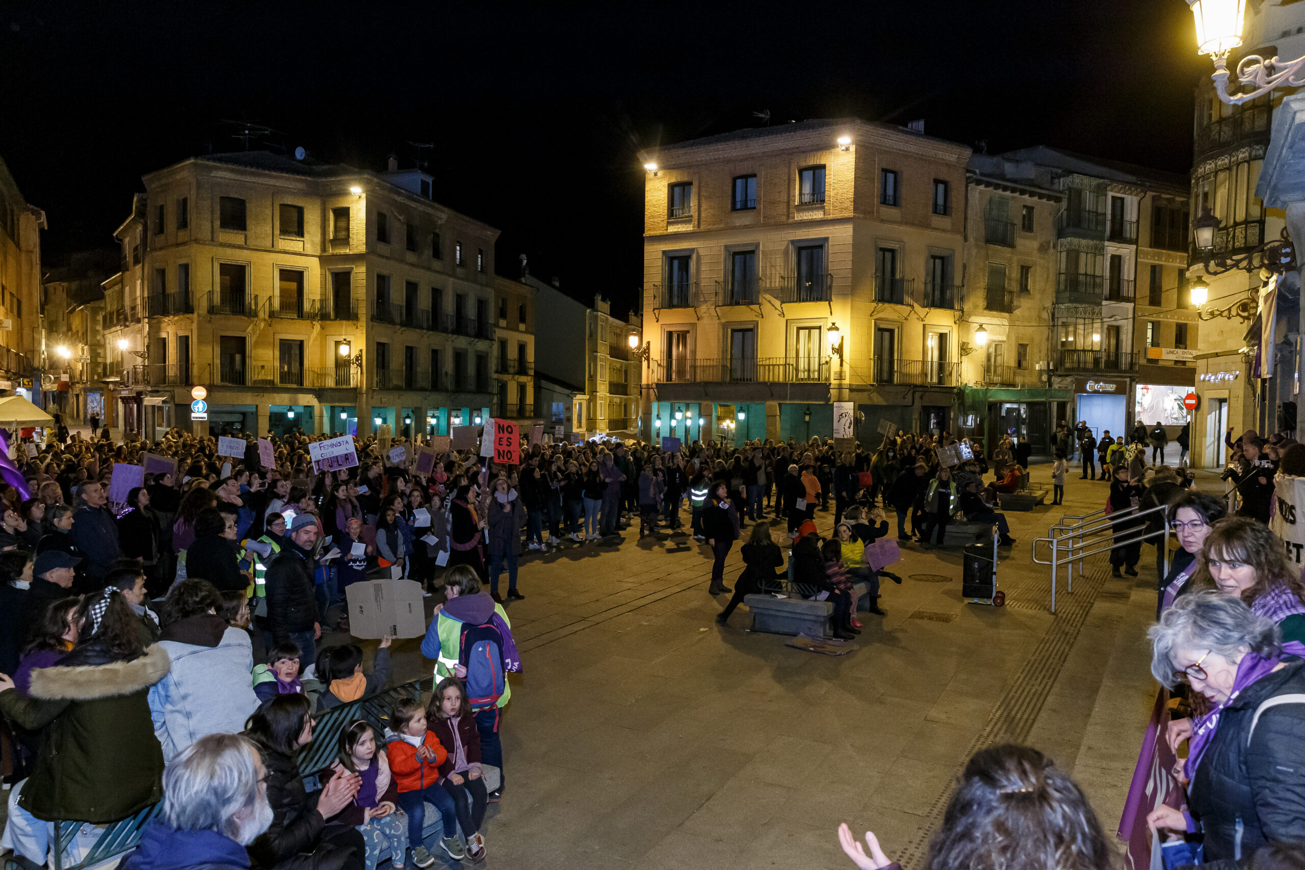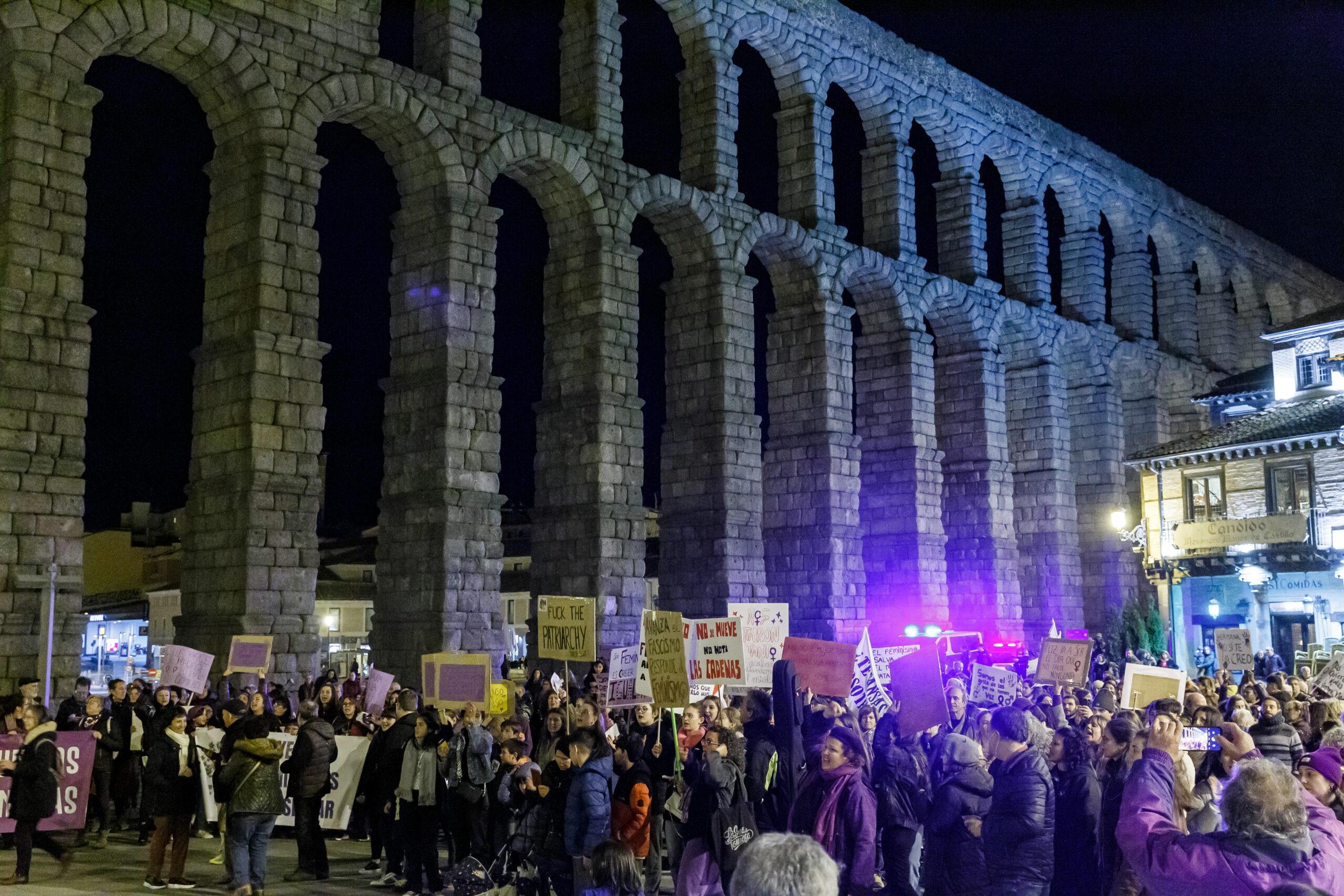 Nuestros derechos no retro en, avanzan. Bajo este lema, un total de 1.500 personas, según el dato oficial ofrecido por la Policía Nacional, secundó hoy la manifestación convocada por la Asamblea 8M Segovia, con un recorrido que transcurrió a un ritmo lento y sin incidentes, entre la Rotonda del Pastor, a las afueras de la ciudad, hasta llegar al Azoguejo, a los pies del Acueducto, donde desde la terraza de Santa Columba se dio lectura a un manifiesto. A lo largo del itinerario, la organización realizó varias paradas con interpretación de canciones reivindicativas.
