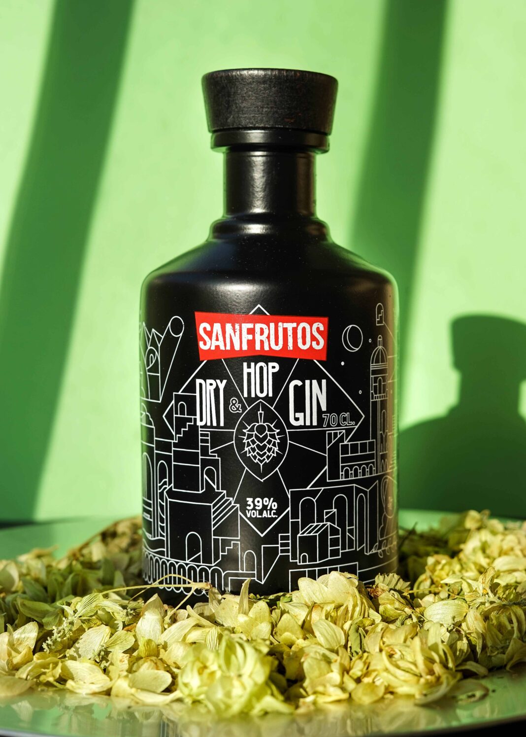 Sanfrutos “Dry & Hop Gin” es una ginebra artesana innovadora y singular, con un dry hopping de lúpulo “Citra”, destilada de manera tradicional en alambiques de cobre con 8 botánicos especialmente seleccionados.