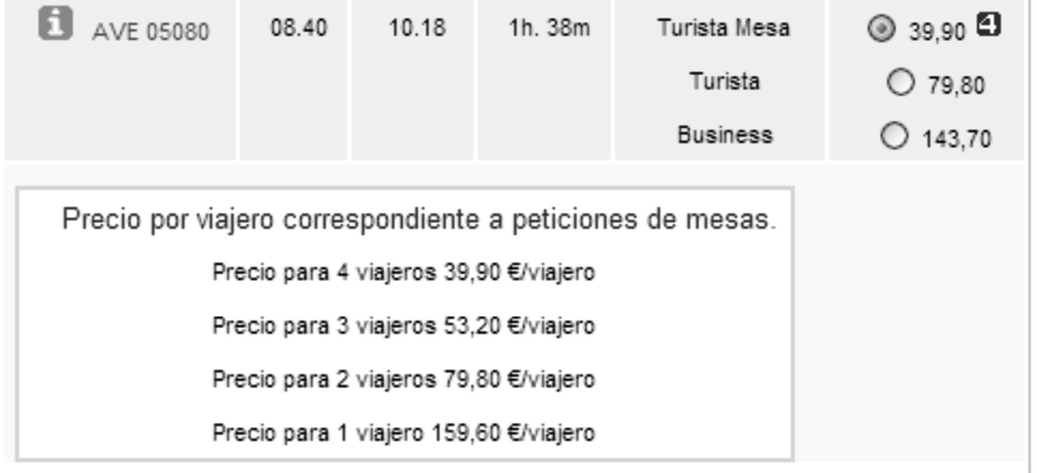 Tomando como ejemplo la tarifa general en el AVE Madrid-Valencia, de 79,8 euros por trayecto, el paquete mesa permitirá comprar los cuatro asientos por 159,60 euros (en lugar de 319,2 euros). De este modo, si viajan cuatro personas cada trayecto le saldrá a 39,90 euros, y si viajan 3 a 53,2 euros por billete.