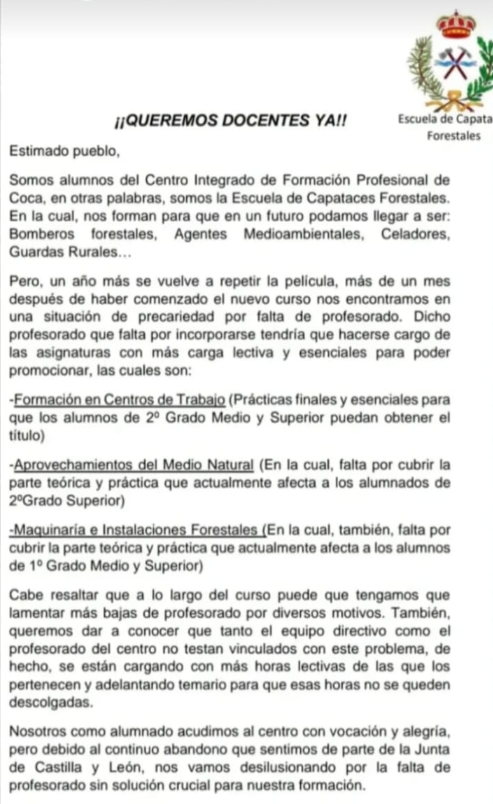 El alumnado de la Escuela de Capacitación Forestal de Coca sigue denunciando la falta de profesores. A sus protestas se suman ahora los padres de los alumnos, quienes aseguran que, «aunque la escuela de Coca lleva sufriendo este problema prácticamente todos los años», este otoño «es un poco más sangrante».