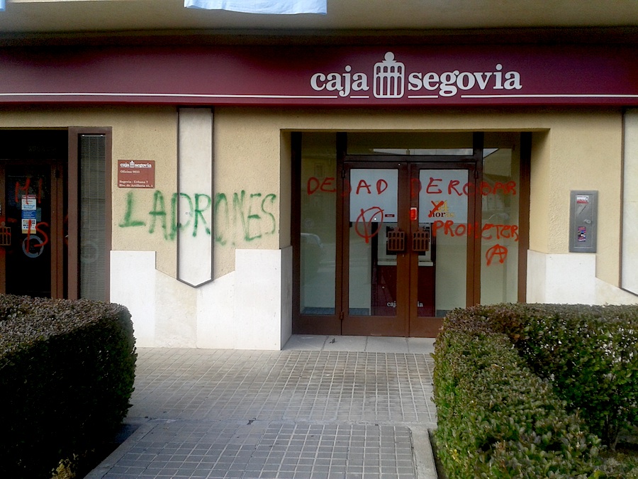 La palabra «ladrones», la más repetida, acompaña a otras críticas como «Sois mi crisis», «Dejad de robar y prometer» o «Usureros». Estas pintadas vienen acompañadas de la polémica creada en torno a las presuntas retribuciones que han sido denunciadas por los miembros de UPyD Segovia y el procurador de Izquierda Unida en las Cortes de Castilla y León, José María González Suarez, sobre los directivos de Caja Segovia.