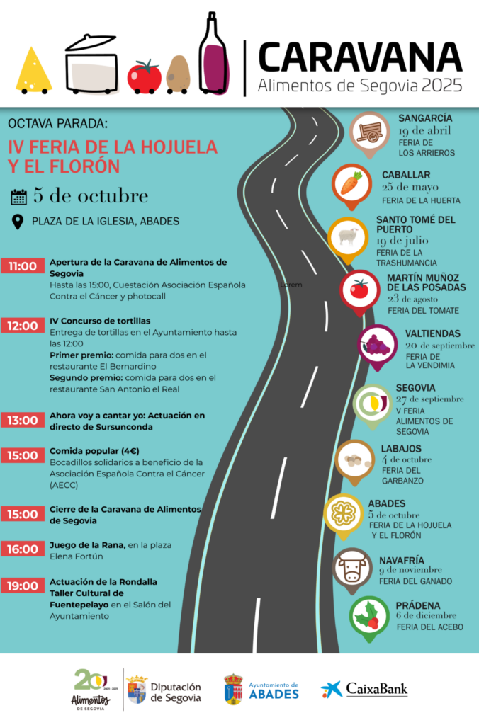 La séptima parada de la Caravana de Alimentos de Segovia que organiza la Diputación de Segovia se fundirá con hojuelas y florones en un pueblo de Segovia. Así, estos dulces, tan típicos de Abades, coprotagonizarán este domingo, 5 de octubre, la cuarta Feria de la localidad junto al programa organizado por la marca agroalimentaria de la Diputación.
