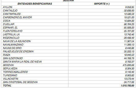 La distribución del convenio para el fomento del empleo en las entidades locales firmado hoy por la administración regional y los responsables municipales de la provincia de Segovia es la que figura en la siguiente tabla.