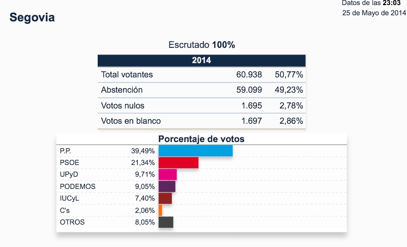 Respecto a 2009, el PP ha perdido un 15% de los votos, pasando de 37.445 en 2009 a 23.399 en estos comicios. Por su parte, el PSOE en 2009 consiguió el 34,36% con un total de 23.614 votos, frente al 21,34% de los votos, que son 12.647. UPYD se consolida en Segovia como tercera fuerza política, pasando de 2.659 votos en 2009 a 5.756 convencidos. La sopresa, sin duda, es la formación PODEMOS que irrumpe en el panorama europeo, con 5.364 votos en nuestra provincia, desplazando a Izquierda Unida, que consigue 4.385 votos frente a los 1.923 de las anteriores elecciones europeas. Ciudadanos es la sexta fuerza política de la provincia con 1.226 votos.