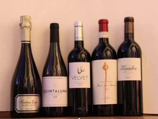 Imagen: Los vinos presentes en la cata, de izquierda a derecha, Tantum Ergo de Bodegas Hispano Suizas, Quintaluna de Ossian Vides y Vinos, Velvet Crianza de Velvety Wines, Finca La Reñana de Bodegas Luis Alegre y Torralvo de Bodegas Vizcarra.