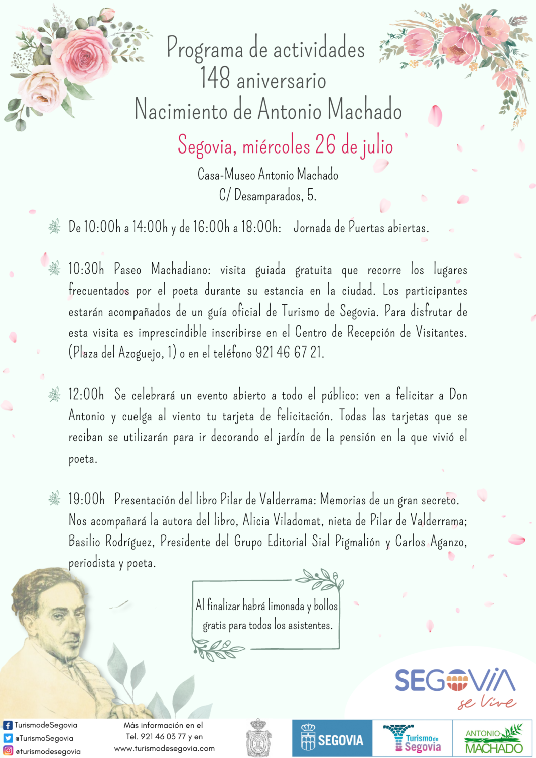 Durante todo el día, la Casa-Museo Antonio Machado ofrecerá una jornada de puertas abiertas y acogerá, ya por la tarde, la presentación de libro: «Pilar de Valderrama: Memorias de un gran secreto», de Alicia Viladomat, nieta de Pilar Valderrama. Además, se celebrará una visita guiada gratuita, «Paseo Machadiano» que recorrerá los lugares frecuentados por el poeta y una actividad que ya se ha convertido en tradicional dentro de la programación, como es la felicitación a Machado a través de mensajes que decorarán el patio de la casa en la que vivió.