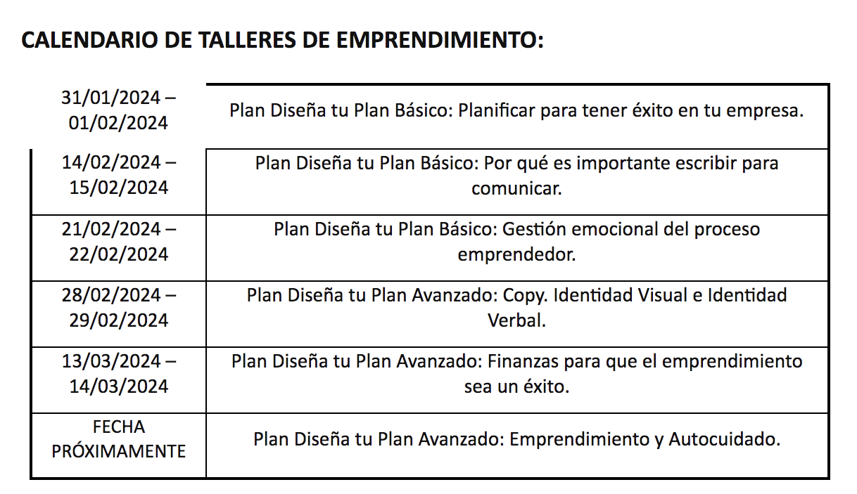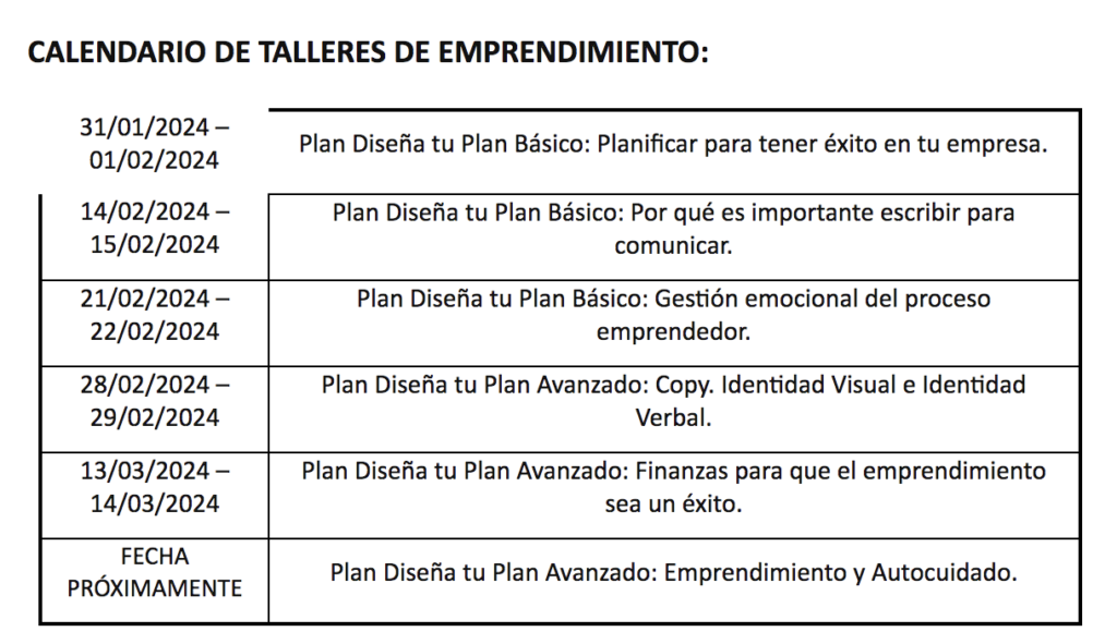 Con los 6 talleres de emprendimiento que se celebrarán a lo largo de los próximos meses en la capital y provincia, y que los próximo están previstos para los días 31 de enero en horario de 14:30 a 16:30 horas, 1 de febrero en horario de 14:30 a 16:30 horas, se pretende llegar al mayor número de potenciales emprendedores para, posteriormente, ayudarles a realizar sus planes de negocio viables para iniciar su actividad empresarial y fomentar el empleo.