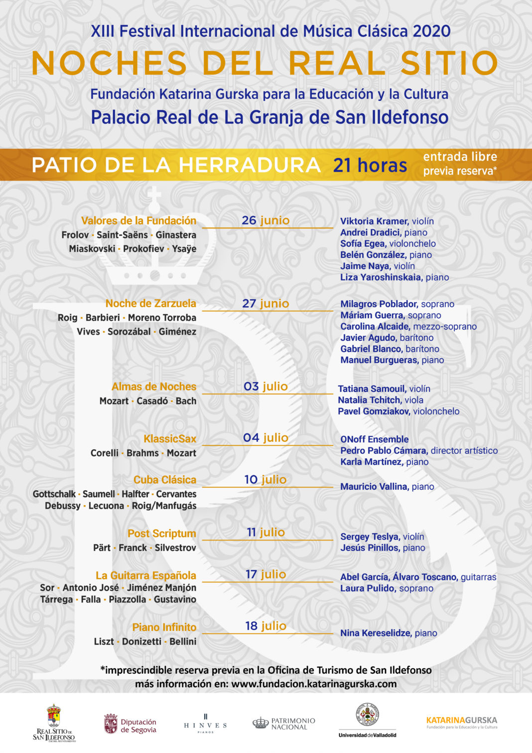 La colaboración institucional entre el Ayuntamiento del Real Sitio, Patrimonio Nacional y la Fundación Katarina Gurska, ha hecho posible que se programen 8 conciertos al aire libre y con las más estrictas medidas de seguridad en el privilegiado enclave del Patio de la Herradura del Palacio Real de La Granja.