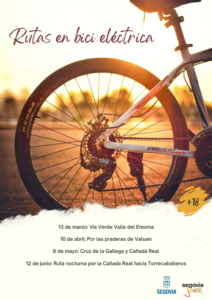 El programa de rutas en bicicleta eléctrica se desarrollará un domingo al mes desde marzo a junio. Son cuatro diferentes rutas que serán guiadas por la empresa Naturcleta. La primera será el 13 de marzo, con salida y llegada en Puente de Hierro. El itinerario planteado es la Vía Verde del Valle Eresma (Segovia – Carbonero de Ahusín), con un recorrido de unos 30-40 km y un nivel de dificultad fácil.