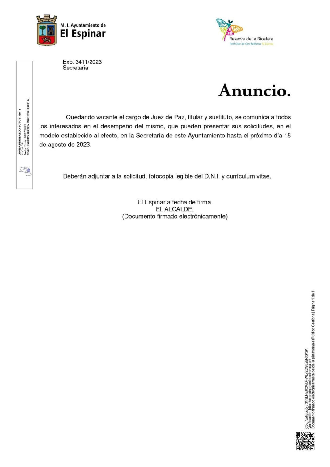 En un anuncio, el consistorio informa de que «quedando vacante el cargo de Juez de Paz, titular y sustituto, se comunica a todos los interesados en el desempeño del mismo, que pueden presentar sus solicitudes».
