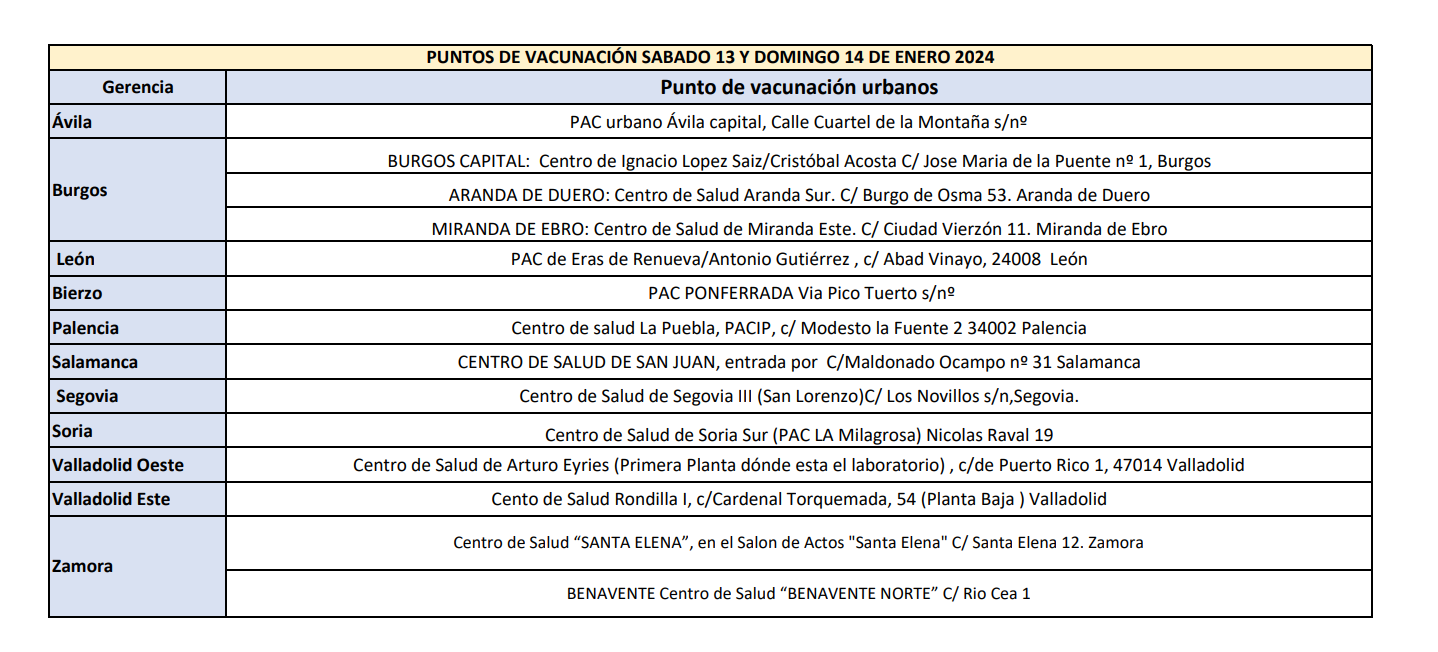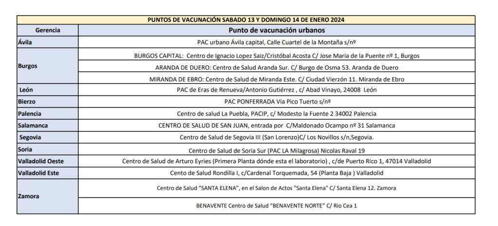 Cada provincia ha adecuado un punto de vacunación correspondiente a su área de salud. Así, León contará con otro en el área de salud del Bierzo y Valladolid pondrá a disposición dos, correspondientes a las áreas de Valladolid Este y Valladolid Oeste. Burgos ofrecerá dos puntos de vacunación adicionales en Aranda de Duero y Miranda de Ebro, y Zamora hará lo propio en Benavente.
