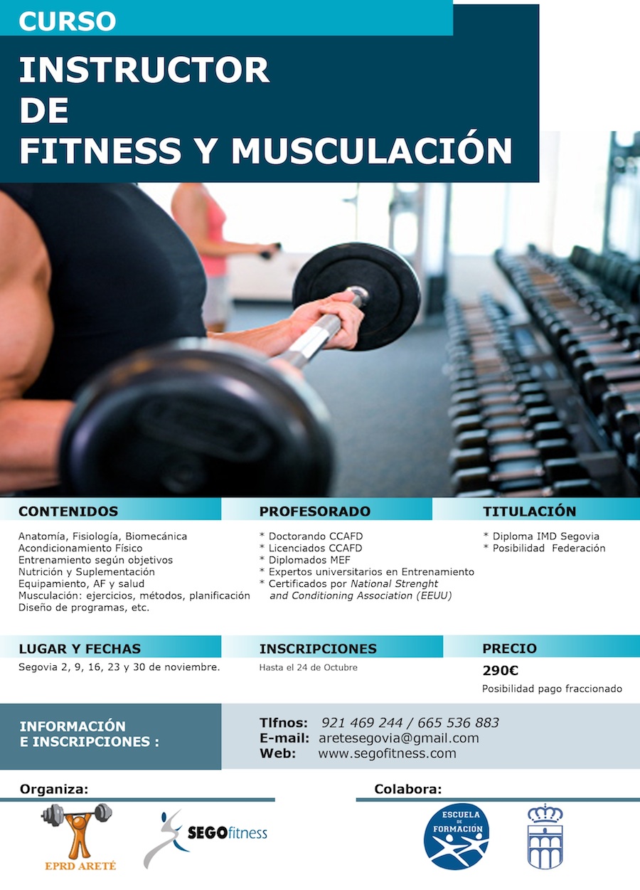 La Escuela de Formación del Instituto Municipal de Deportes continúa con su programación anual. Ahora, junto a la EPRD Areté y Segofitness, lanza una nueva edición del curso de Instructor de Fitness y Musculación que se impartirá del 2 al 30 de noviembre, los cinco sábados de ese mes, en el aula del Centro Cívico Nueva Segovia, junto al pabellón «Pedro Delgado».