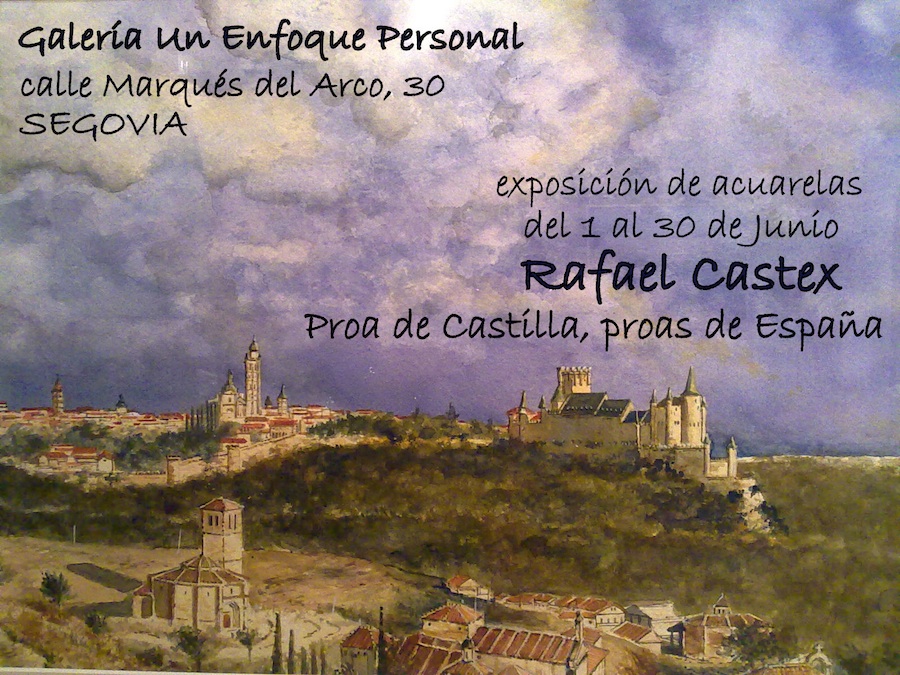 El pintor Rafael Castex presenta su exposición de acuarelas ‘Proa de Castilla, Proas de España’, que tendrá lugar durante todo el mes de junio en la galería Un Enfoque Personal, ubicado en la calle Marqués del Arco de la capital segoviana. El horario será de lunes a sábado, de 11:00 a 14:00 horas, y de 17:00 a 20:00 horas, y los domingos de 12:00 a 14:30 horas.