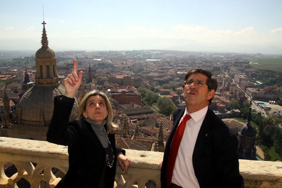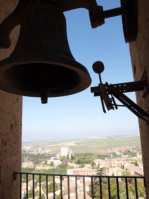 Tras conseguir subir los 300 escalones que tiene, pasar por la antigua casa del sacristán y continuar subiendo, no sin alguna parada para admirar el paisaje segoviano, y dicho sea de paso para descansar, coronamos de la mano de Jesús Postigo y Mercedes Sanz el tope de la torre en el que su sombra se extiende por la ciudad.