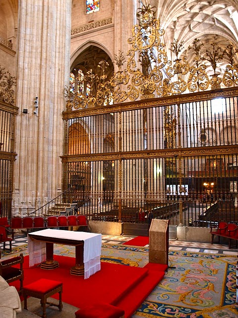 Pero eso, corresponde a capítulos posteriores, y ahora nos encontramos junto a Jesús Postigo y Mercedes Sanz frente al coro. A diferencia de la catedrales europeas, éste se encuentra en el centre atendiendo a las necesidades acústicas de una iglesia en la que se celebrara la misa cantada y andada; es decir, una misa que se llevaba a cabo a pie entre las diferentes capillas y cantando, funcionando así de caja musical.