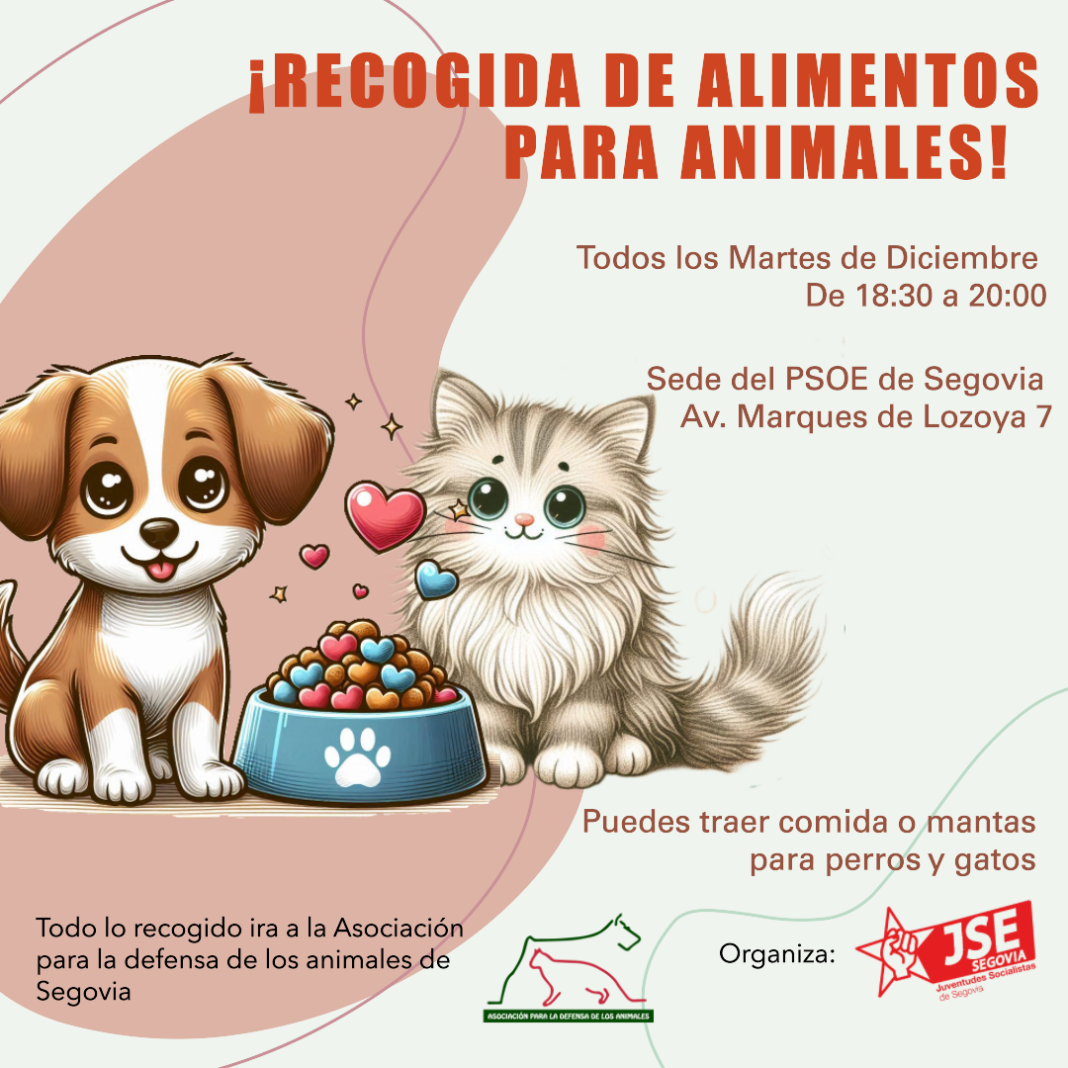 Se podrán donar comida y mantas para perros y gatos todos los martes del mes de diciembre en la sede del PSOE de Segovia, en la Avenida Marqués de Lozoya, 7.